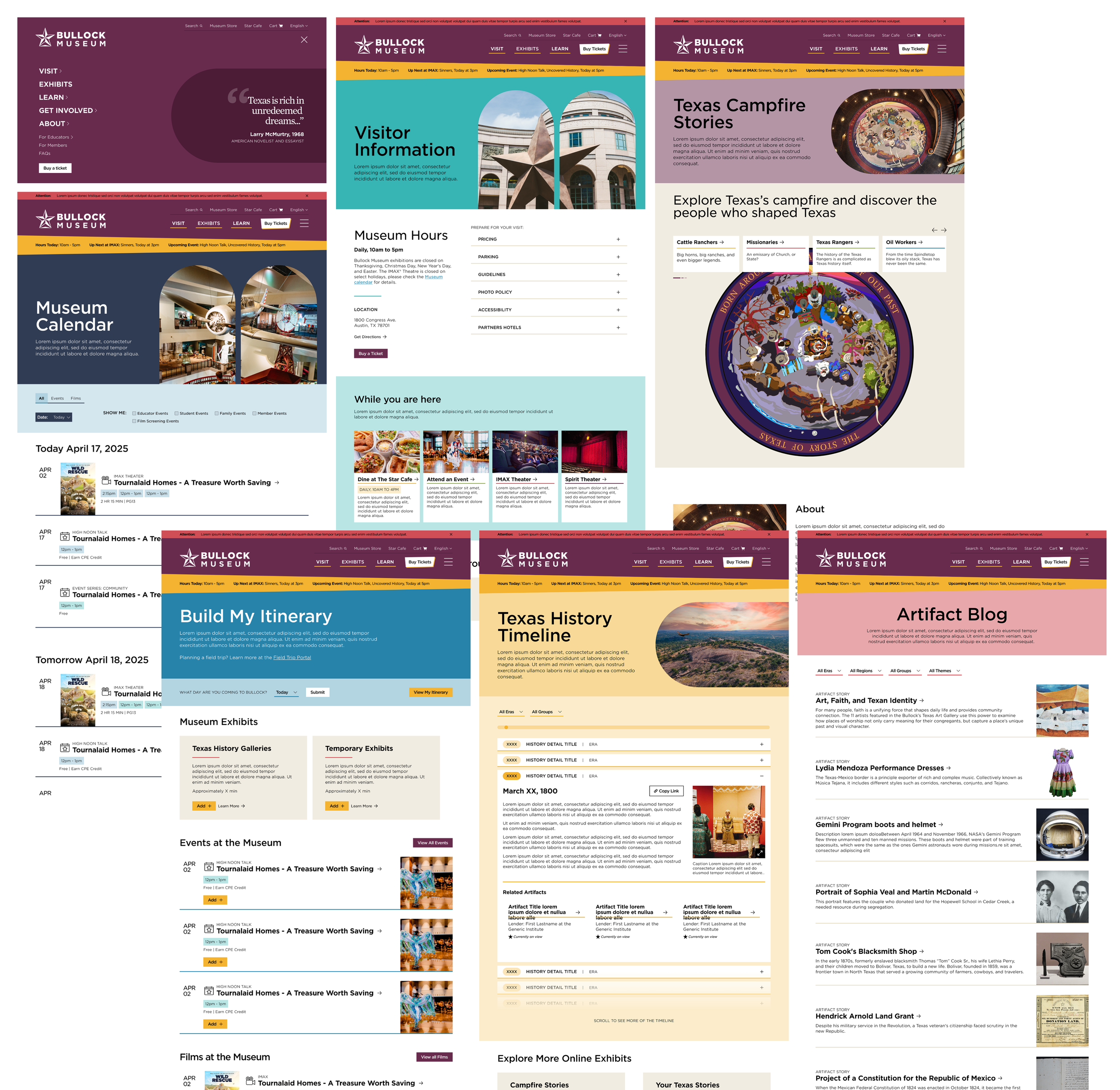 The final website unifies the full Bullock experience by supporting trip planning, sharing Texas stories, and encouraging continued learning. It includes a streamlined navigation and ticketing flow, an aggregated calendar of films and events, an artifact library, interactive history timeline, itinerary builder, and more.