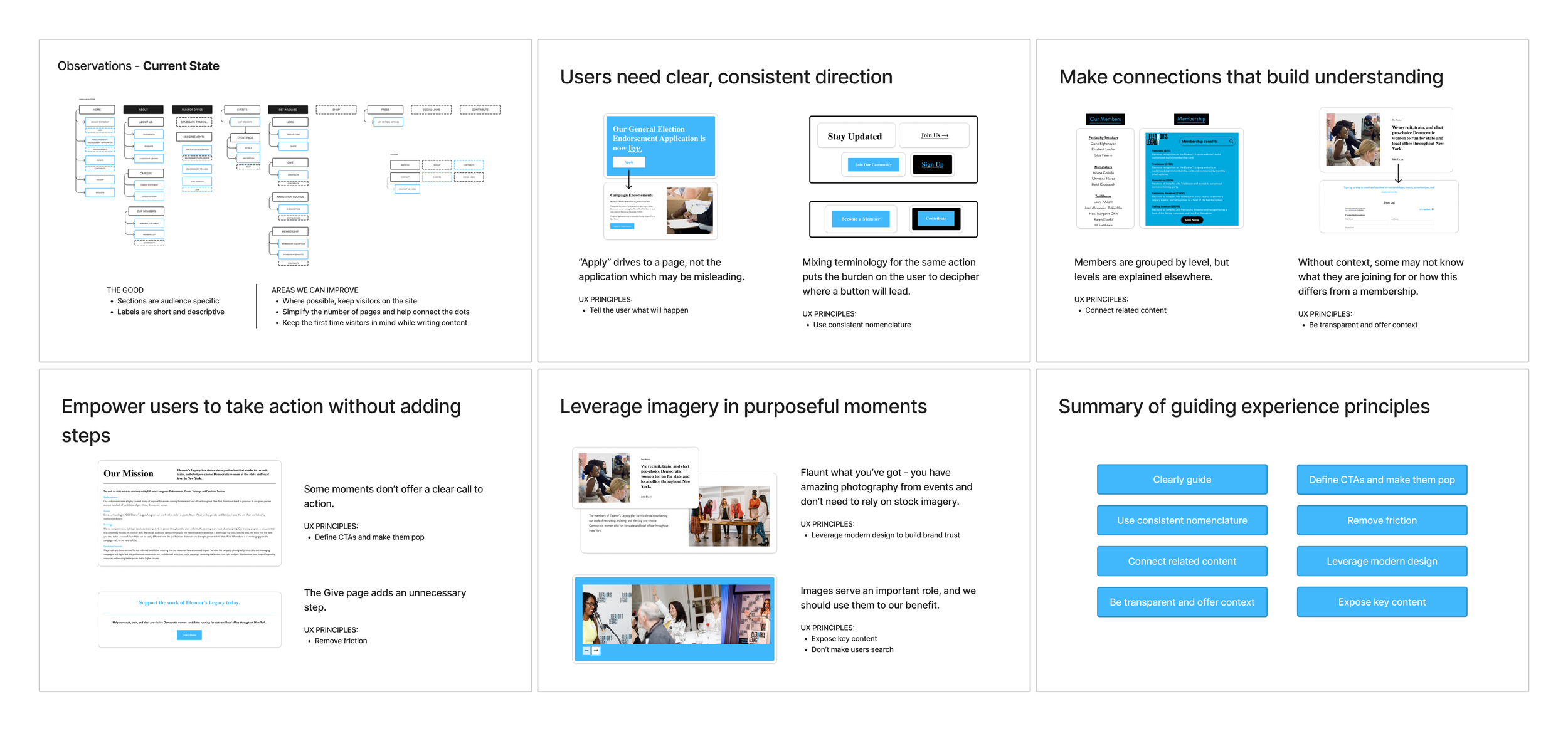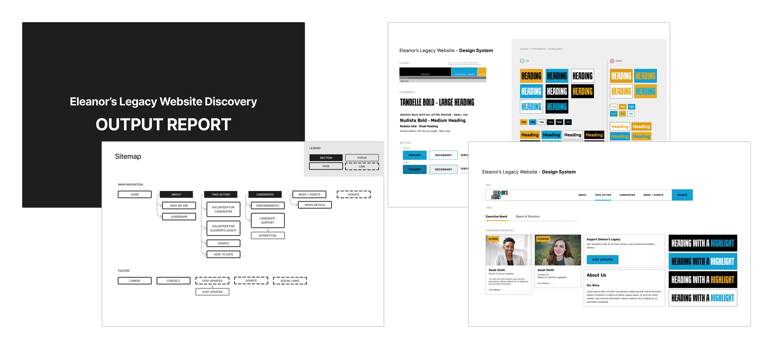 I summarized my recommendations into an output report for Eleanor’s Legacy to use as a guide as they update the website. The report included a summary of the audience needs, experience principles, sitemap, content outline, lo-fi wireframes, style guide, and more.