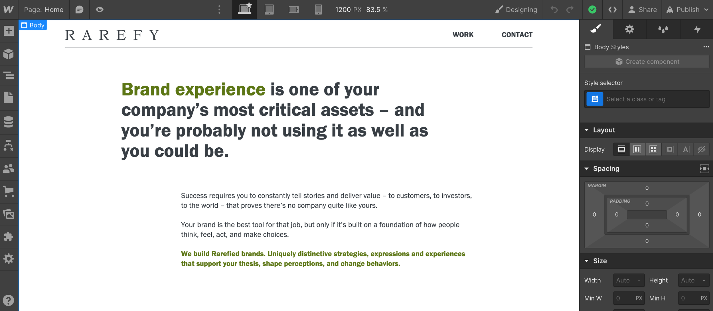 I designed and developed a fully functional, responsive website with a framework that will make it easy for Rarefy to edit and add content as they grow. I published a streamlined version of the website and created systems to easily add new case studies, adjust the logo quilt, add components to the home page, and build new pages. The website was built and hosted on Webflow.