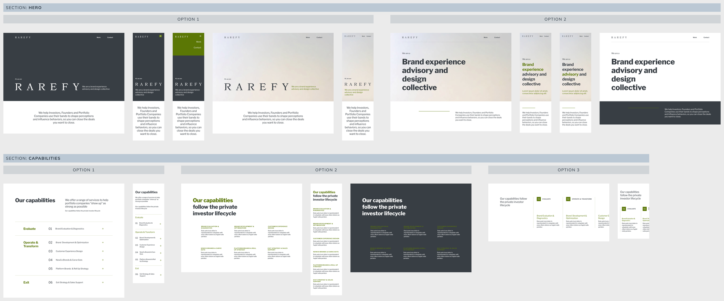 Using Rarefy’s existing style guide, I explored various layouts for key sections of the site. After collecting feedback from the clients, I developed animated prototypes of the full website.