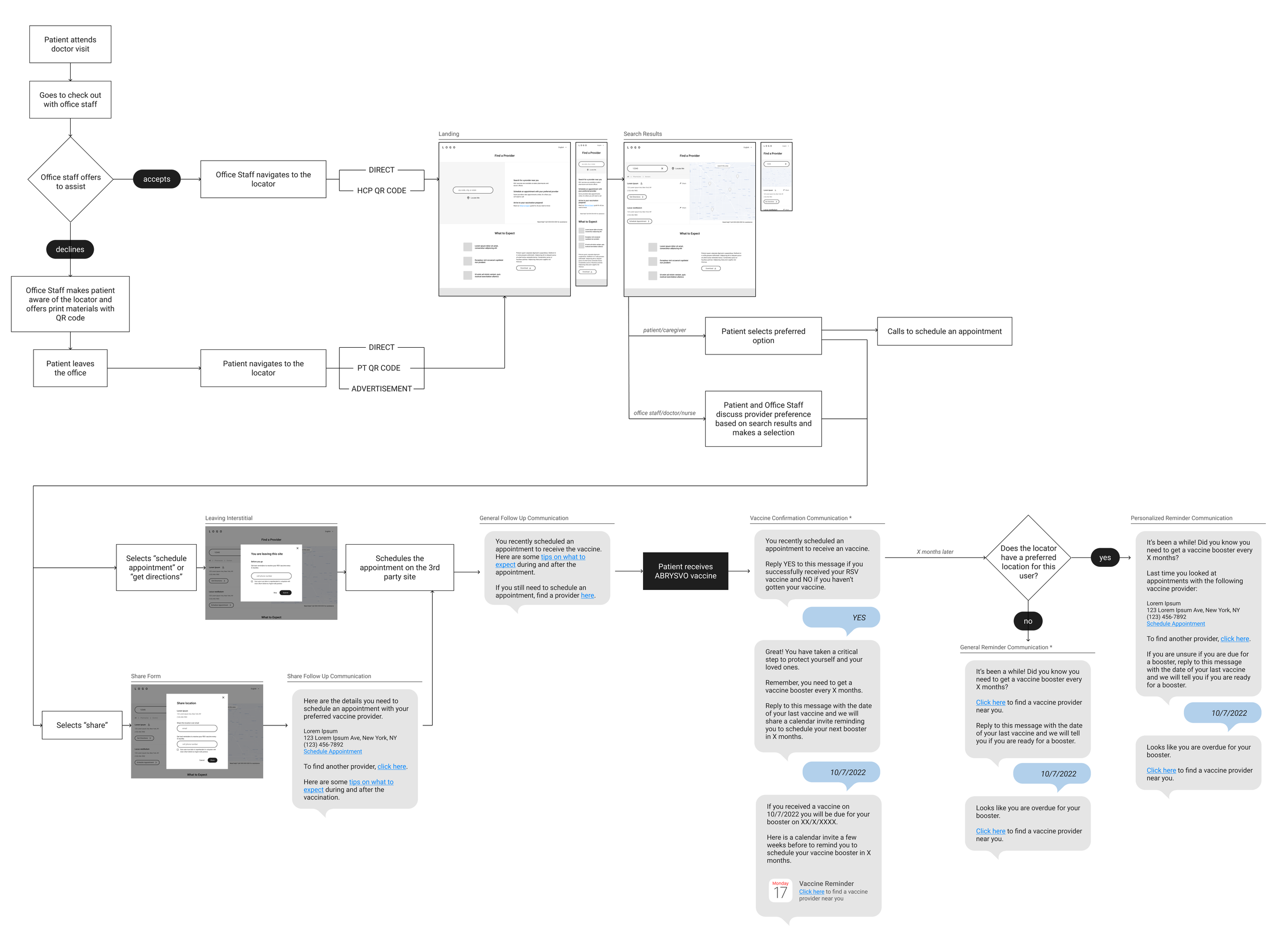 Since most large pharmacies have their own appointment booking platforms, we needed to consider how our tool would complement those services without introducing double communications or complexity. We developed a user flow to vet our approach: