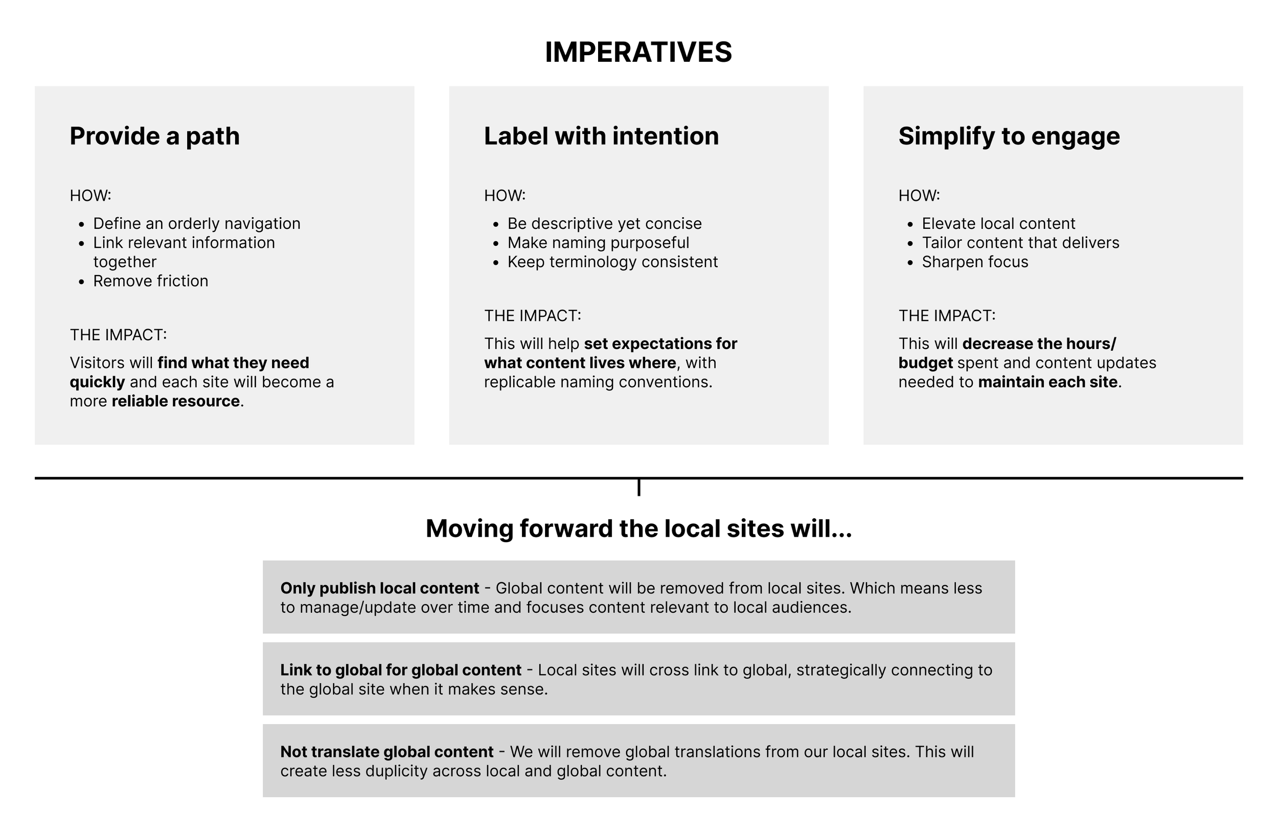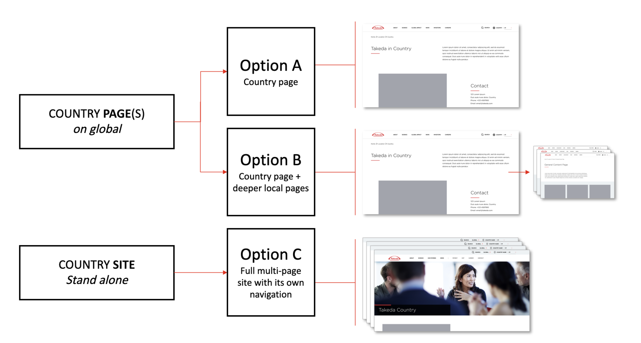 Using our findings, we defined local website strategy make of three website option that build in complexity. We validated the approach with the Task force and built a flexible information architecture for each option based on content audits from 10 sample countries.